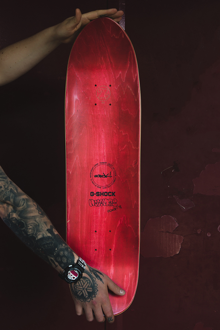 Thomas Marecki alias Marok ist Künstler, Skateboarder, Grafikdesigner und Herausgeber des »Lodown Magazin«. Zusammen mit G-Shock designte er dieses Frühjahr ein Skate Deck mit heftigem 90er Flair, der durch das Zusammenspiel eines wilden Schwarz-Weiß-Musters auf der Rückseite und einer Bubble-Gum roten Oberseite zustande kommt.