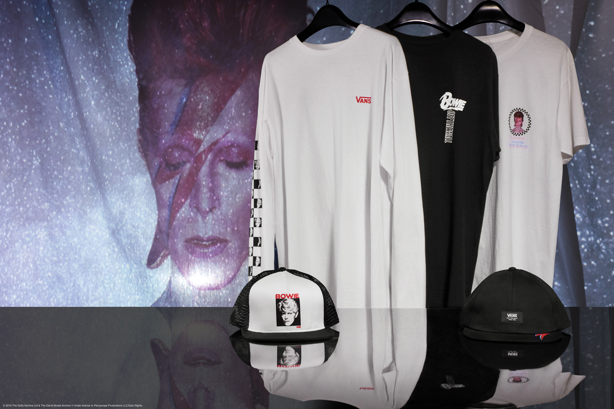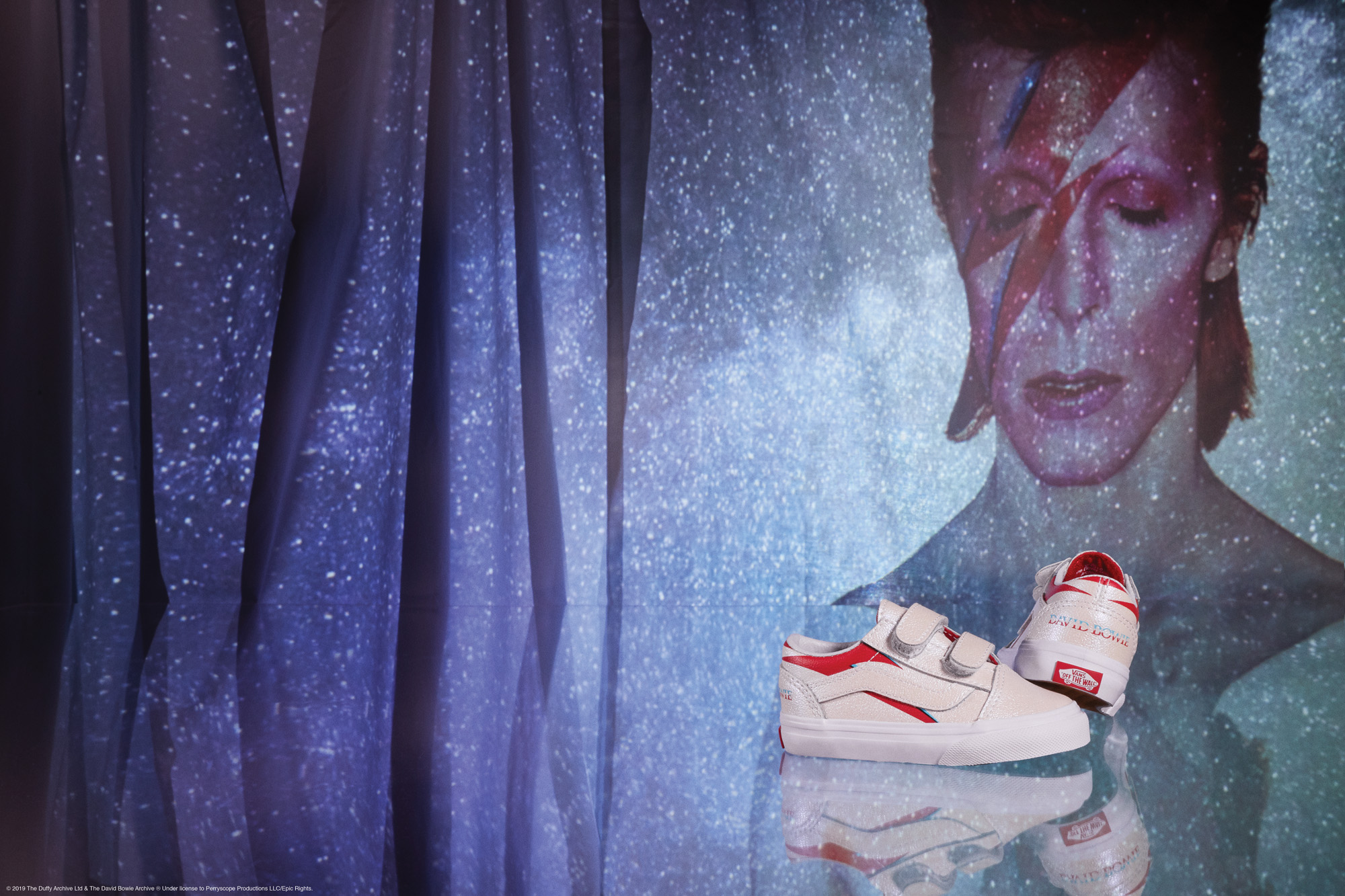 Die gesamte Kollektion, zu der immerhin mehrere Schuhe, Apparel und Accessoires gehören, ist inspiriert von ikonischen Momenten aus Bowie Karriere sowie berühmten Album-Covern.
