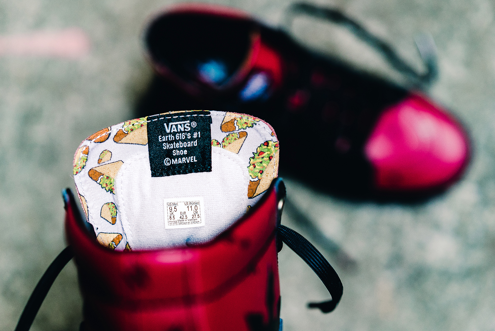 Da Deadpool sonst keine übermenschlichen Fähigkeiten aufweist, greift er gerne mal zum Wurfstern oder seinen Kartana-Schwertern, die ebenfalls auf der Außenseite und an der Ferse des Sneakers zu finden sind. Was natürlich nicht fehlen darf und wir dezent im Lining des Sneakers finden – Tacos, das einzige was Deadpools vorlautes Mundwerk wenigstens kurz zum Schweigen bringt und ihn umso sympathischer macht.