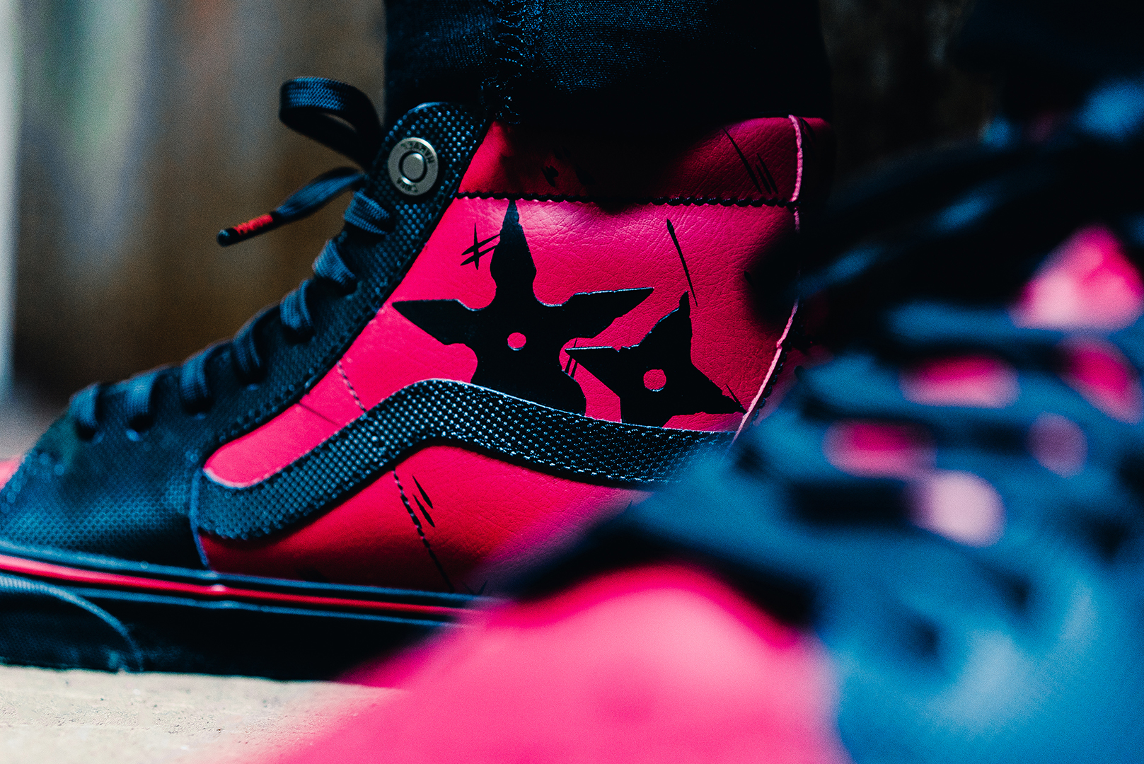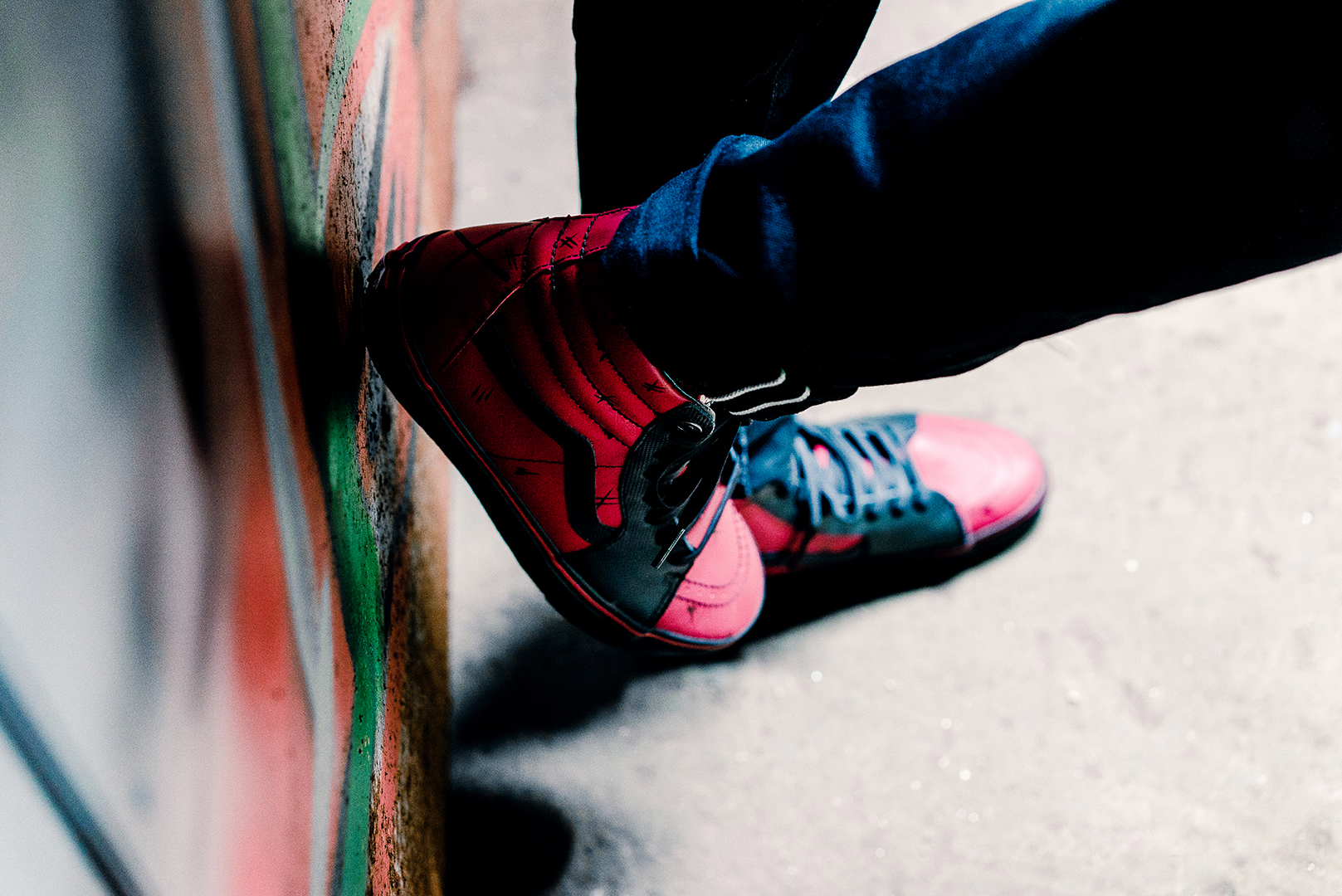 Das Upper des SK8-Hi kommt in Rot mit schwarzen Details, genau wie der Anzug des Anti-Helden mit der großen Klappe. Die kleinen „Kratzer“ auf dem Upper und ein Blutfleck auf der Sohle zeigen Deadpools Selbstheilungs-Fähigkeiten, die dafür verantwortlich sind, dass er sich ohne jegliche Angst in Kämpfe stürzt und dabei auch mal den ein oder anderen Kratzer davonträgt.
