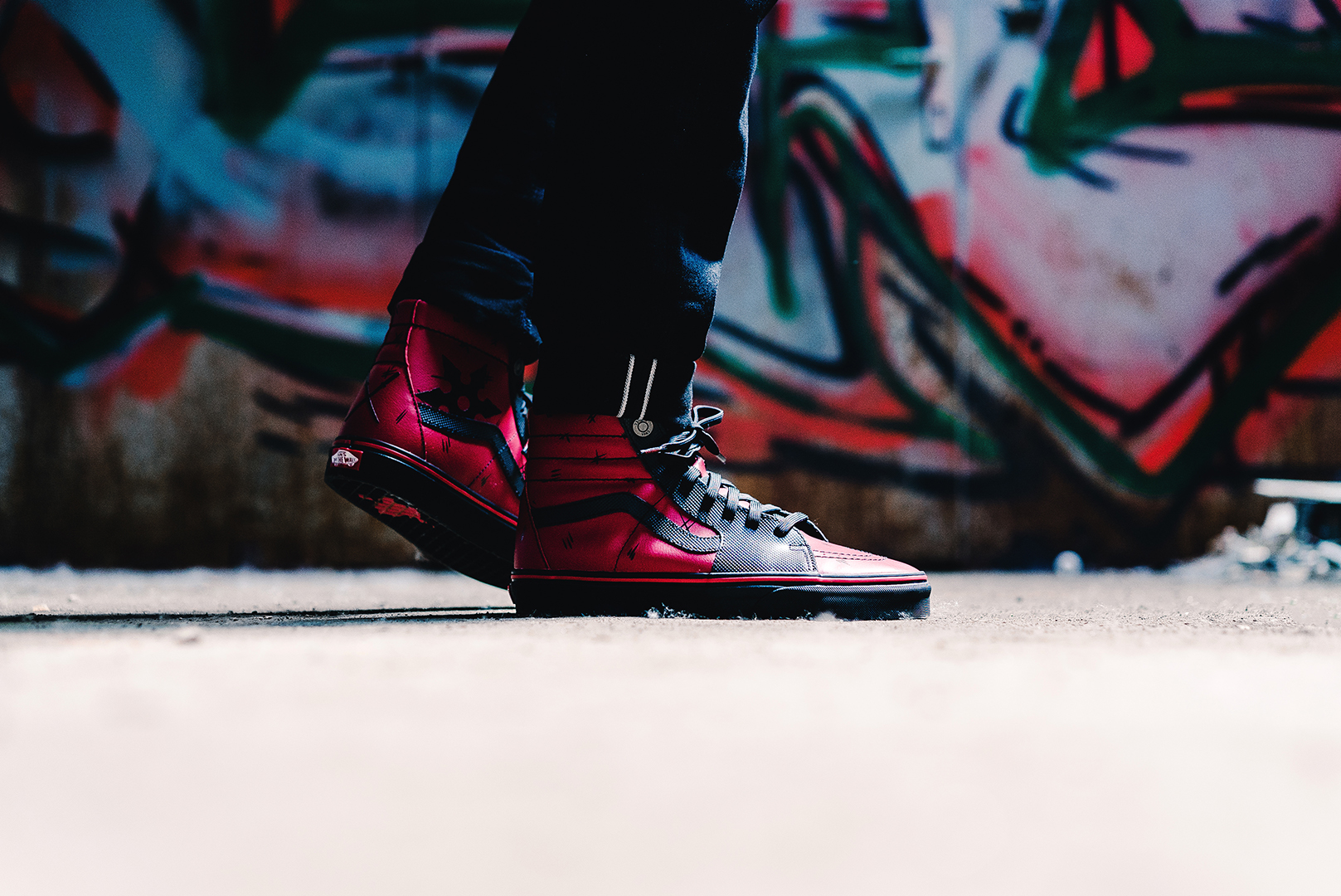Das Upper des SK8-Hi kommt in Rot mit schwarzen Details, genau wie der Anzug des Anti-Helden mit der großen Klappe. Die kleinen „Kratzer“ auf dem Upper und ein Blutfleck auf der Sohle zeigen Deadpools Selbstheilungs-Fähigkeiten, die dafür verantwortlich sind, dass er sich ohne jegliche Angst in Kämpfe stürzt und dabei auch mal den ein oder anderen Kratzer davonträgt.