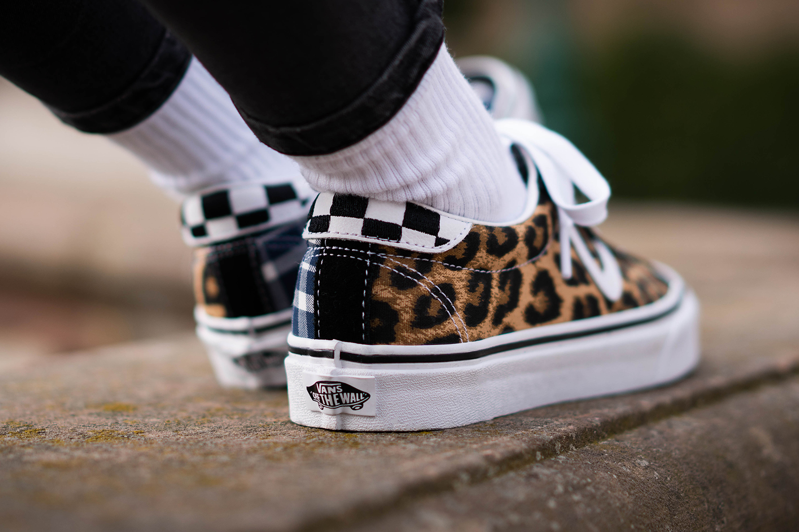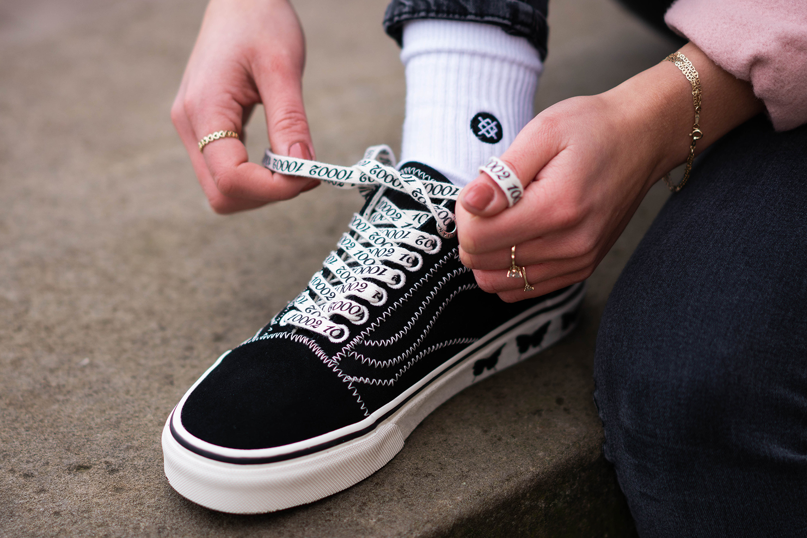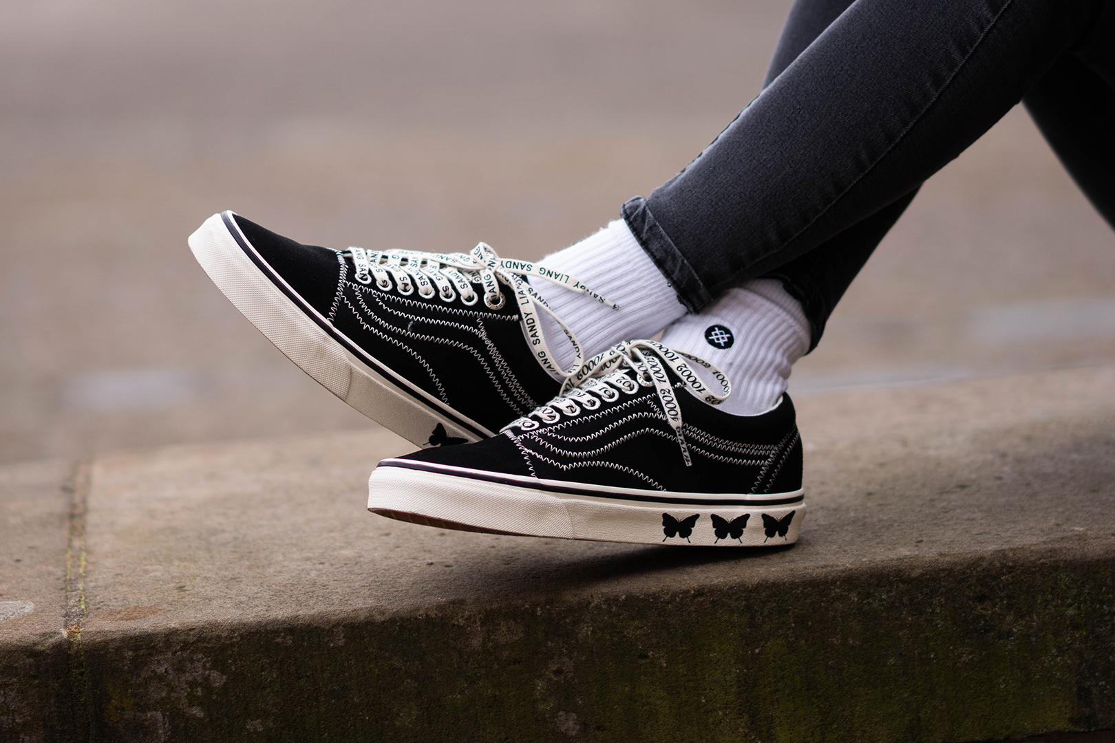 Den Vans x Sandy Liang Sport ziert ein raffiniertes Design auf dem Upper: Auf der einen Seite finden wir ein Schotten-Muster, während die andere Seite in aufregenden Leo-Prints erstrahlt! Vollendet wird der Muster-Mix durch Vans traditionelles Checkerboard-Muster an der Ferse. Die Footwear-Reihe wird durch ein zweites Old Skool Modell komplettiert, für das sich Sandy von L.E.S. inspirieren ließ. So stattete sie das Upper mit einer schwarzen Canvas-Base aus, welche durch weiße Nähte unterbrochen wird. Blickfang sind hier die Schmetterlinge am hinteren Teil der Sohle und ein customized Stitching auf dem Heel.