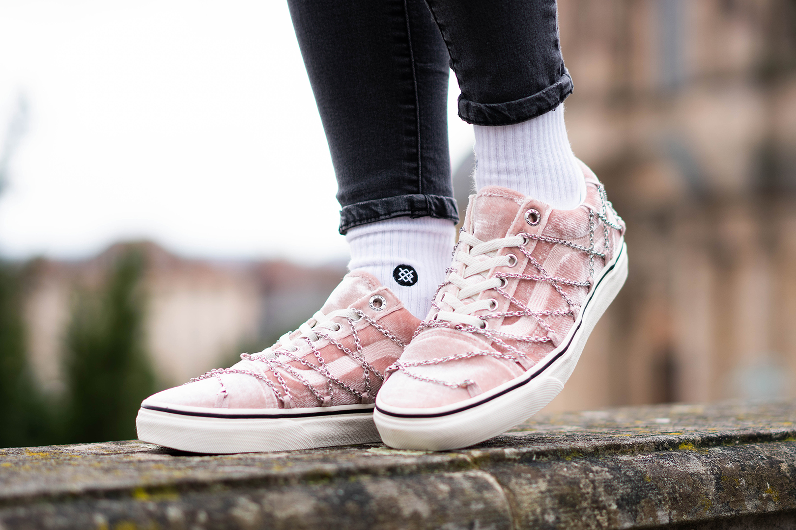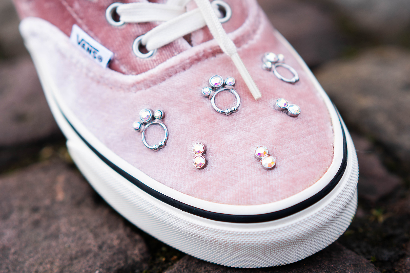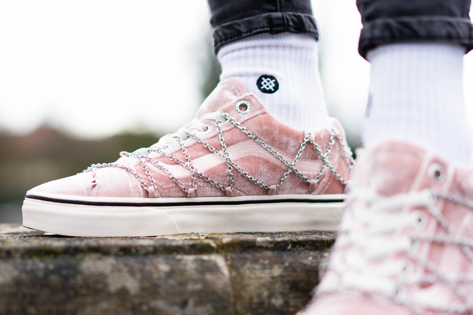 Highlights der Kollektion sind der Vans Era und der Old Skool. Beide Silhouetten kommen mit einem schimmernden Velours-Upper in Rosa daher. Während der Old Skool noch mit silbernen Ketten-Details versehen wurde, wird das Obermaterial des Era durch funkelnde Akzente unterbrochen. Absolutes Hingucker ist das silberne Fußkettchen, das am Upper befestigt ist und sich problemlos um die Knöchel legt.