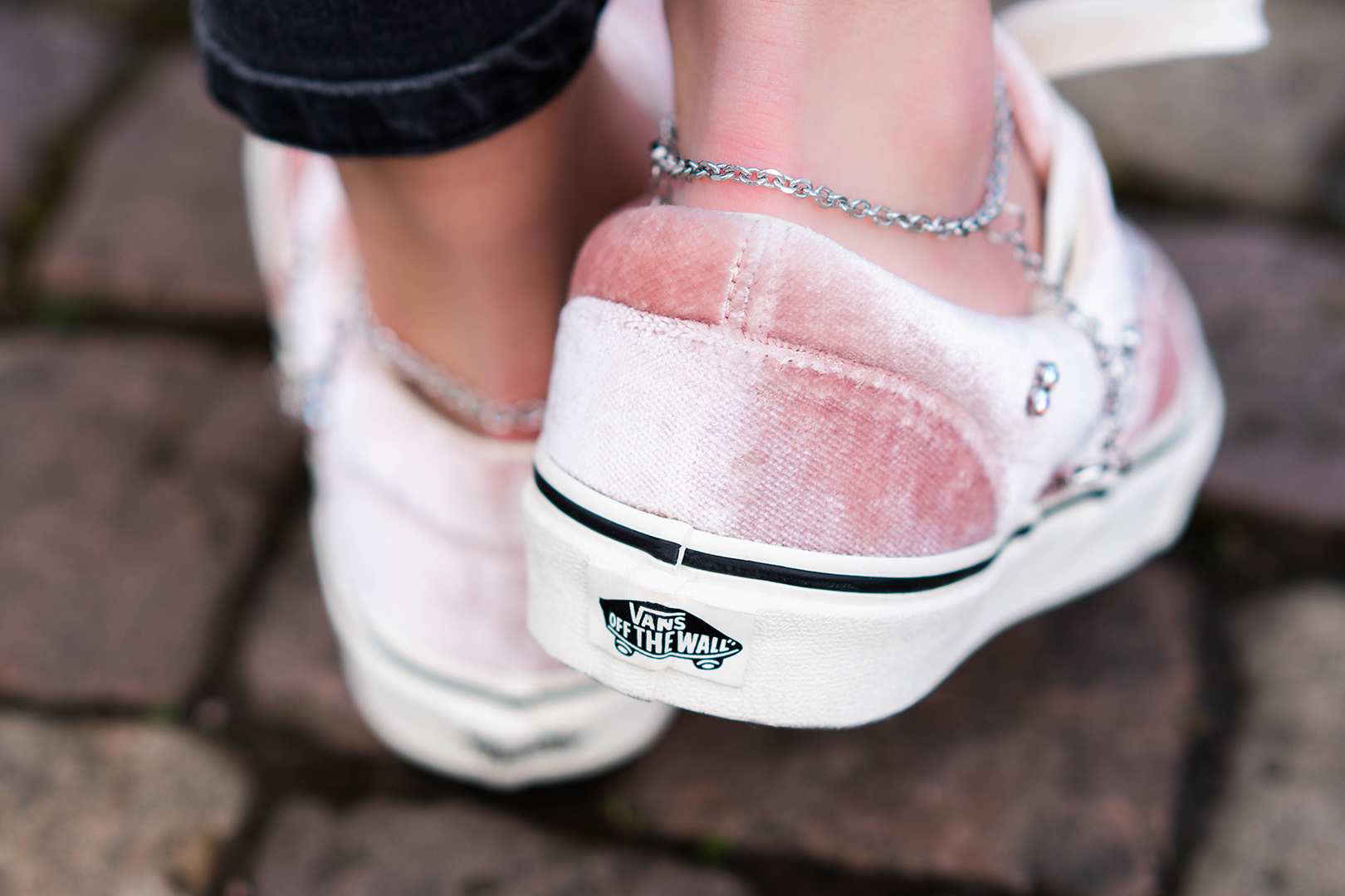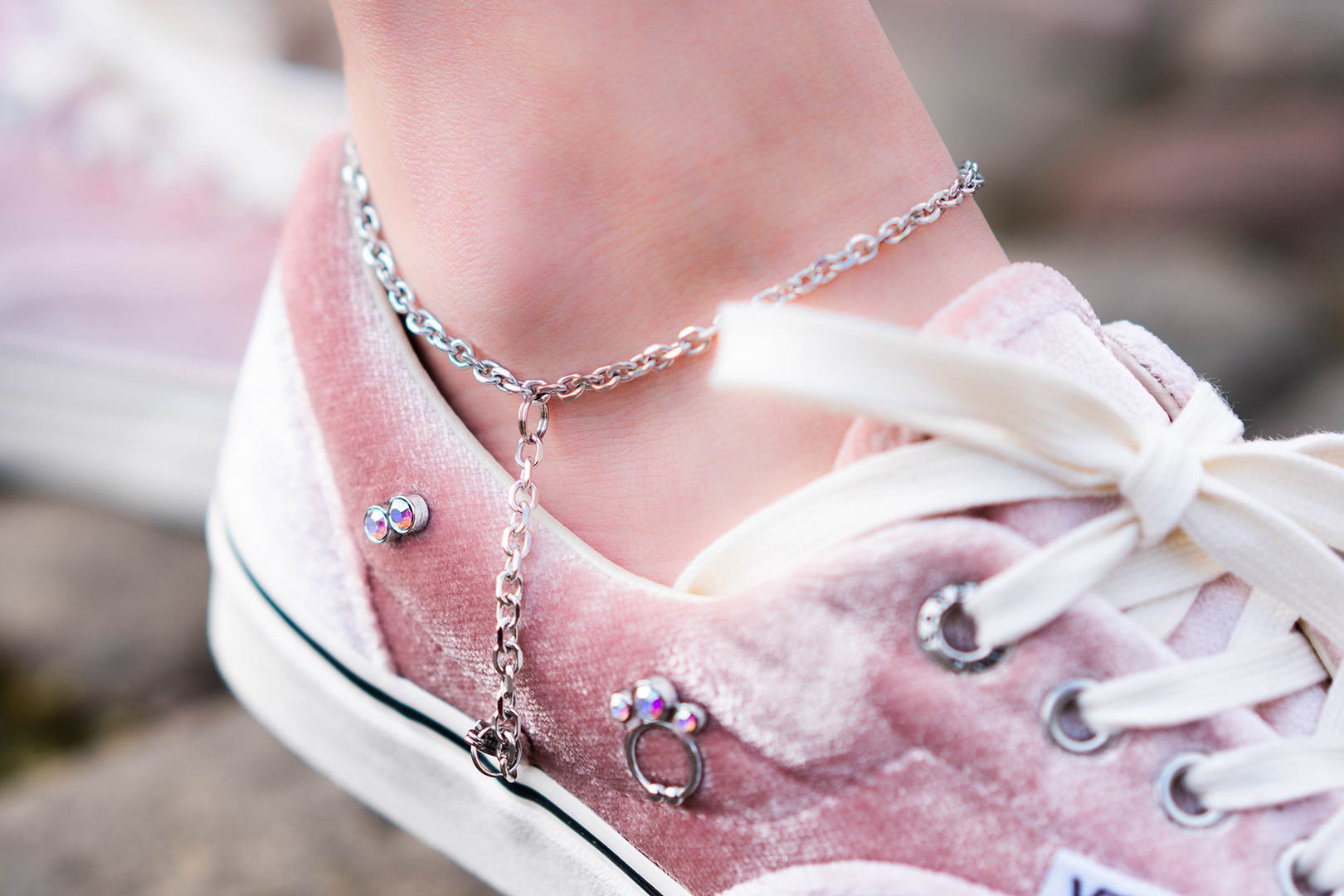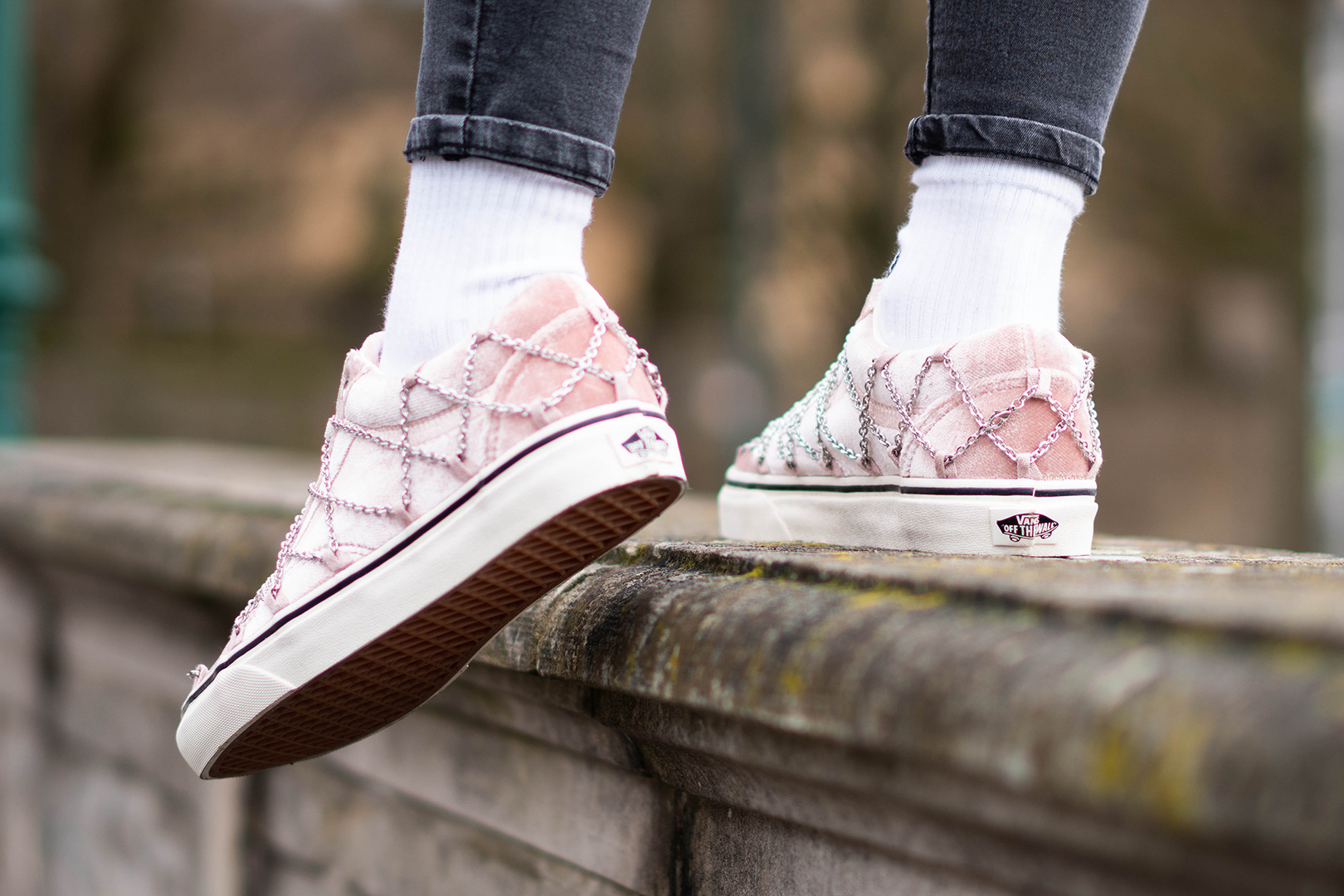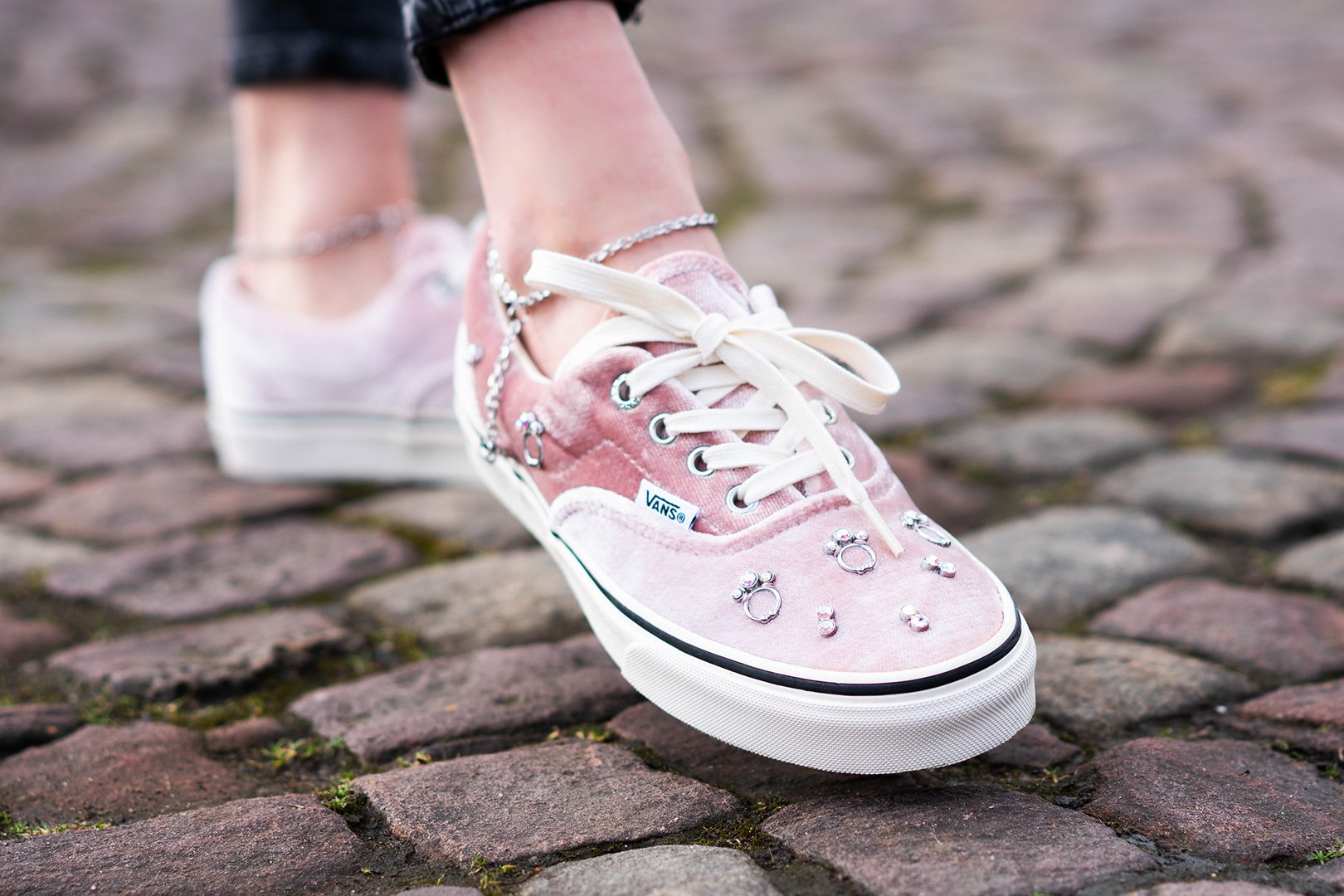 Highlights der Kollektion sind der Vans Era und der Old Skool. Beide Silhouetten kommen mit einem schimmernden Velours-Upper in Rosa daher. Während der Old Skool noch mit silbernen Ketten-Details versehen wurde, wird das Obermaterial des Era durch funkelnde Akzente unterbrochen. Absolutes Hingucker ist das silberne Fußkettchen, das am Upper befestigt ist und sich problemlos um die Knöchel legt.